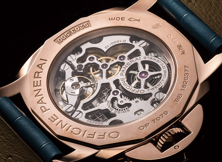 ▲P.1000/10机芯是P.1000机芯的镂空版,所以不同于沛纳海常见的3/4夹板机芯,以往被遮住的机芯零件,现在都可以从表背一一欣赏,赏玩度加分不少。