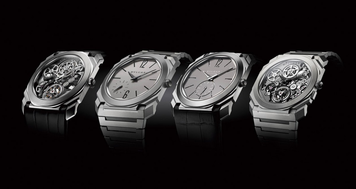 (左起)Octo 超薄镂空陀飞轮腕表、Octo 超薄自动上链腕表、Octo 超薄三问腕表、Octo 超薄自动上链陀飞轮腕表。