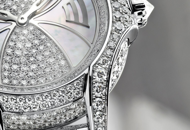 珠宝表要做得到位必须兼顾两大基础——精湛珠宝镶嵌工艺及专业制表技术,Diva Joaillerie珠宝腕表承袭品牌在女表设计上的深厚传统,融会高档材质与别致造型等特点,除了18K白金表壳镶嵌数以百计的钻石,面盘上也透过宝石的排列组合打造出犹如沙漏形状,在珍珠母贝材质的烘托下看起来既美丽又不致沦为俗气,且3点与9点方向各有一枚不规则造型罗马数字时标,佩戴者阅读时间顿时有了考靠的指标;另外表款每个金属链节也密致地镶上钻石,整只腕表含表壳、面盘以及链袋等部分总计镶嵌870颗美钻,奢华气派完全不在话下。同时别忘了,表款的宝石镶嵌都是在严谨慎重之下依靠工匠以手工悉心完成,所谓的工艺质感正是如此。