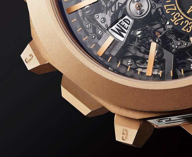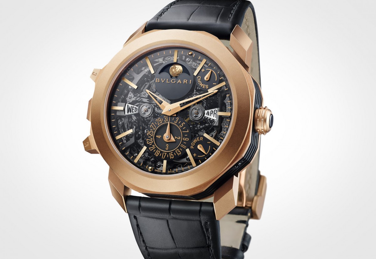 BVLGARI Octo Grande Sonnerie万年历陀飞轮钟乐报时大自鸣腕表无疑是一只大满贯的腕表,拥有它就拥有了腕表极大多数的功能,不过即便拥有再丰富的内涵,腕表的面盘却一再的低调且清晰。腕表以18K玫瑰金打造,配合其独一无二的独特以及优质的传声表现,面盘採镂空设计,让复杂的机械运作一览无遗。同样以玫瑰金打造时标与指针,功能的面盘则平衡的分布于四周,像是3点钟位置为英文月份简写显示;四点钟和五点钟时标之间则是走时的动力储存显示;六点钟位置为月份和闰年显示综合小表盘,透过粗、细指针个别指示;9点钟位置是英文星期简写显示盘;12点钟位置的品牌Logo则融会了月相显示盘;1点钟和2点钟之间则是报时动力储存显示。月份和星期分别以转盘的方式运用英文简写与日期显示的阿拉伯数字作区隔,各功能之间都採用不重复的元素呈现一目了然的视觉效果。当腕表启动大自鸣功能后,通过四只音锤的精准敲击,机芯便可实现小时、刻钟以及分钟的报时。