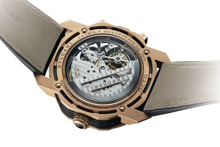 能集结如此丰富且复杂于一表,背后必须由一个强大的机芯支撑,Octo Grande Sonnerie万年历陀飞轮钟乐报时大自鸣腕表搭载BVL 5307自动上链机芯,与2011款Daniel Roth Grande Sonnerie Quantieme Perpetual腕表中使用的5307机芯大致相同,其实从这裡不难发现,腕表其实充满了Daniel Roth和Gerald Genta复杂时计和该系列的影子。即便腕表功能再多,但是整体而言宝格丽都将其精简融会于仅有的按把,为让诸多功能和平共处,宝格丽也在功能的调整上做了许多安全装置和静音功能,部分功能无法在同时间进行操作。如此华丽且复杂的腕表甫问世即被纳入囊中物,可见顶级市场对于宝格丽钟表给予的厚望与期待。