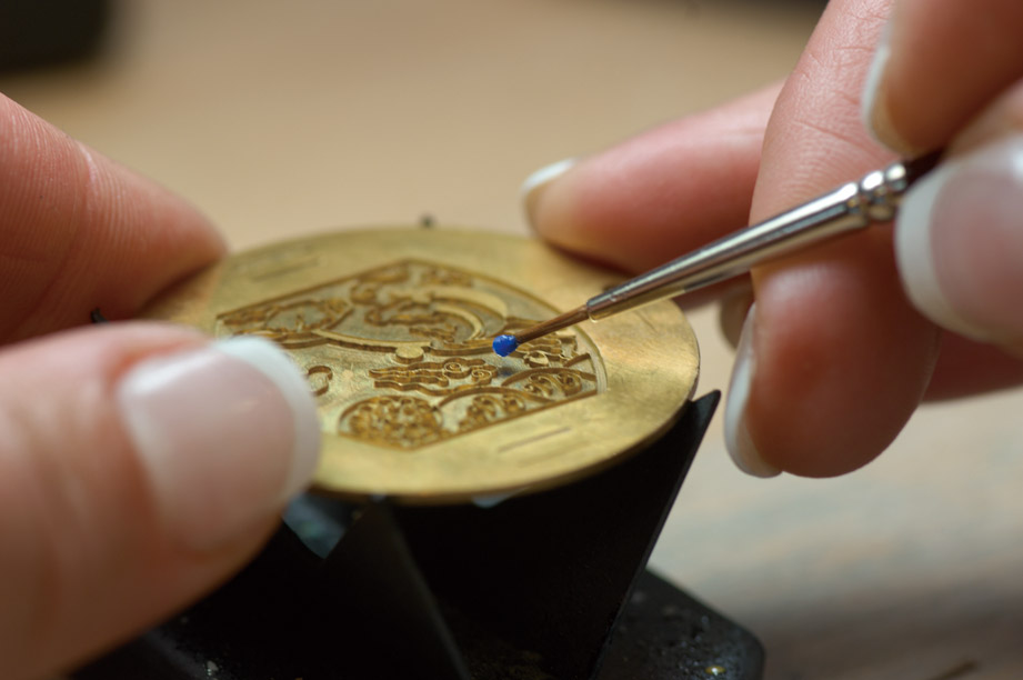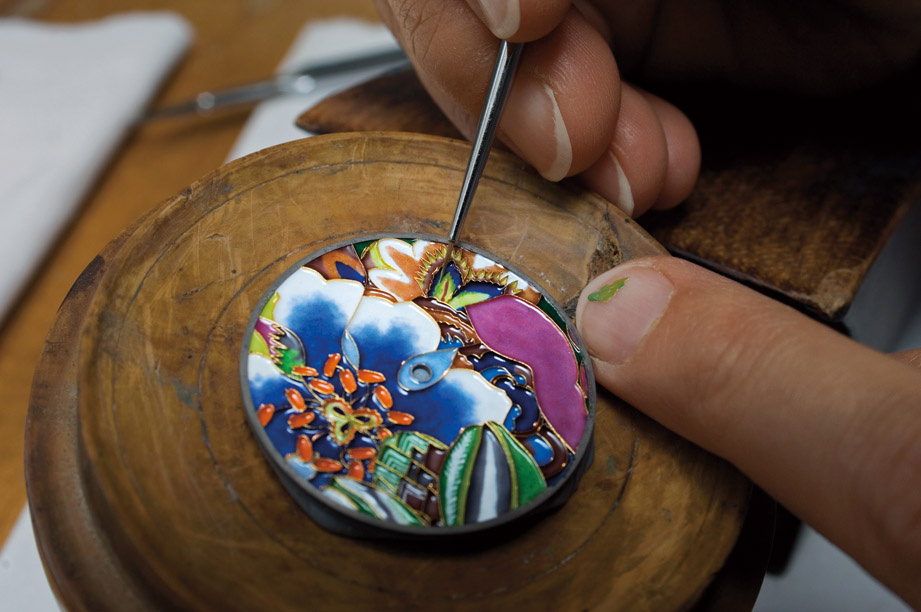 接着工艺师会挑选适用于各个区块的多元色调,透过画笔蘸取珐琅釉料为面盘填涂色彩,以呈现出图案的鲜活灵动感,上色后入窑烧结,起码需重复五次的上色与烘烤过程,确认图案完整无瑕、色块亦忠实保留后,工艺师才能进行后续的打磨与拋光手续,最后装配上机芯、指针与表壳等才算大功告成。