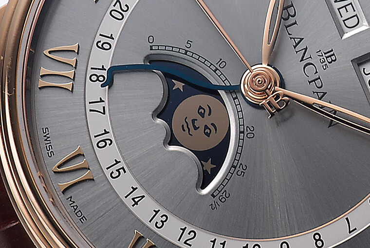 其实全日历加月相表不少品牌都有出,整体的设计格局採用这种视窗搭配指针的样式也不算少数,但是宝珀的全历月相表有几个主要特色,包含日期指针的设计、月相拟人化设计,再加上外观几乎看不出的调校按把,这些都是在同质性表款中能让宝珀全历表脱颖而出的关键,毕竟在一个看起来大致相似的设计架构下,愈能突显自己特色的表愈会让人想要戴上手。