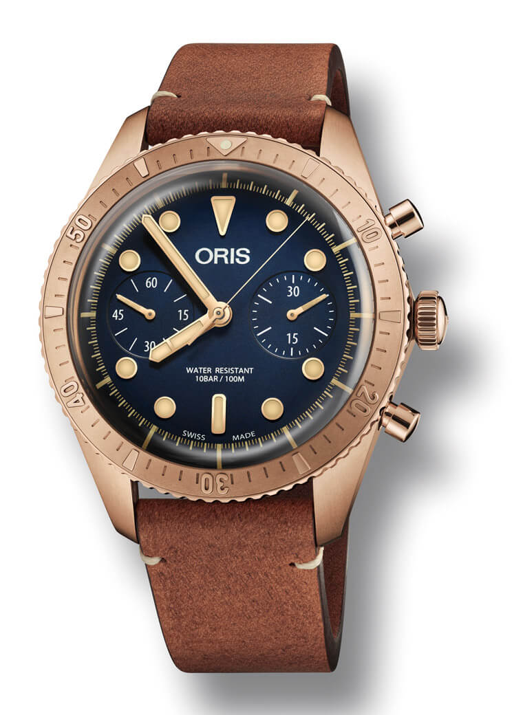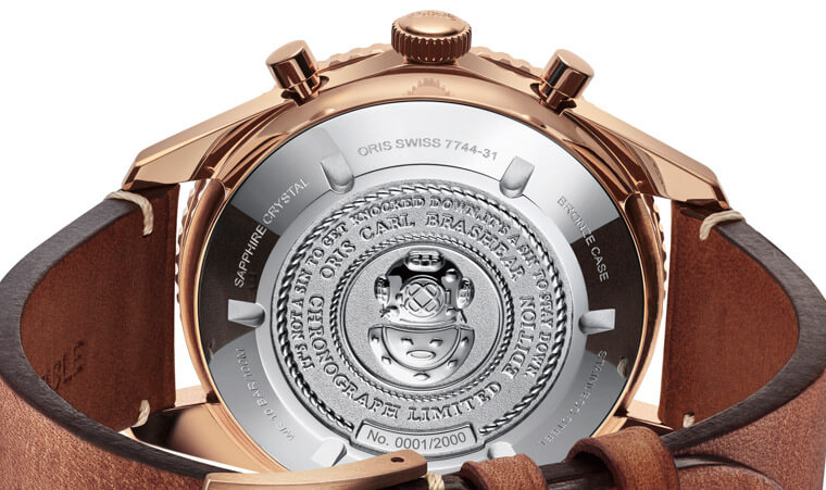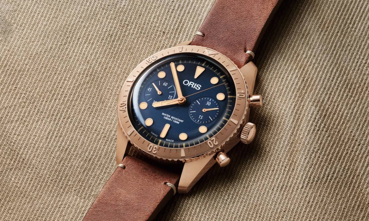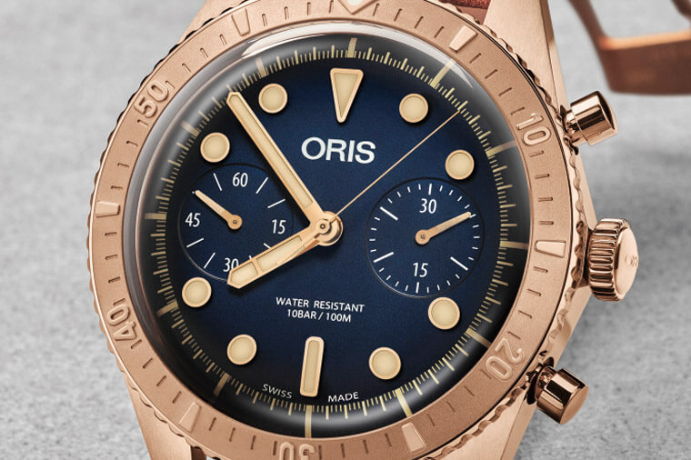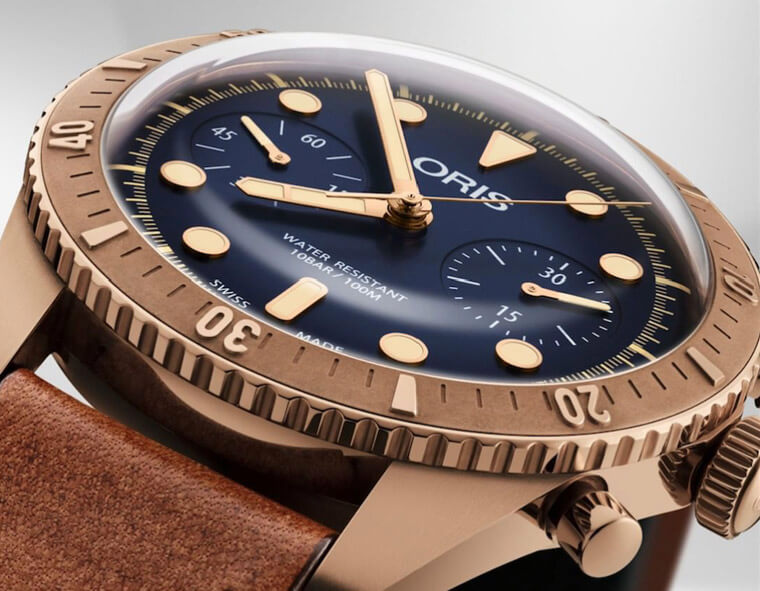 ORIS 2018年发表的这款Carl Brashear限量计时码表是品牌的第二款铜壳表,上一只是2016年的时候推出的三针款,同样是以纪念美国海军的传奇潜水士官长Carl Brashear为名所发行的限量款式。2016年当时市面上已经有不少铜壳表款了,ORIS在这个时候加入对消费者来说新鲜感已经不像早几年那麼强烈了,不过他们家推出这款的另一个重要意义是将铜壳表款的价位带到了相对入门的阶段,从这个角度来看对市场仍然很有意义。青铜表壳以材料成本和成型加工而言并不是一项昂贵的技术,过去铜壳表之所以会给人稀有的印象是因为有几家强势品牌推出了话题款式造成了洛阳纸贵的效应,但回归到实际面,它其实并不应该被这般炒作,ORIS的加入某种程度上也算是点破了这件事。