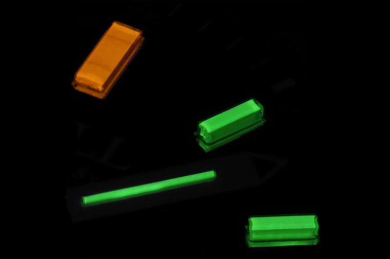 ▲面盘的发光气灯随着时标体积大小不同,顏色也有差异,让佩戴者在暗处更容易辨识时间。