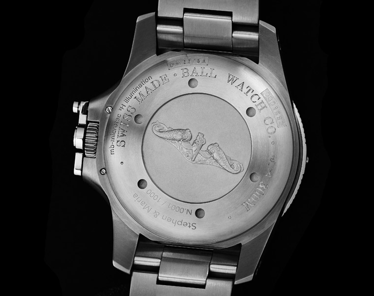 ▲採用实底盖设计确保表款保有300米防水性能,同时底盖还刻上美国海军潜艇标志,突显腕表设计渊源。
