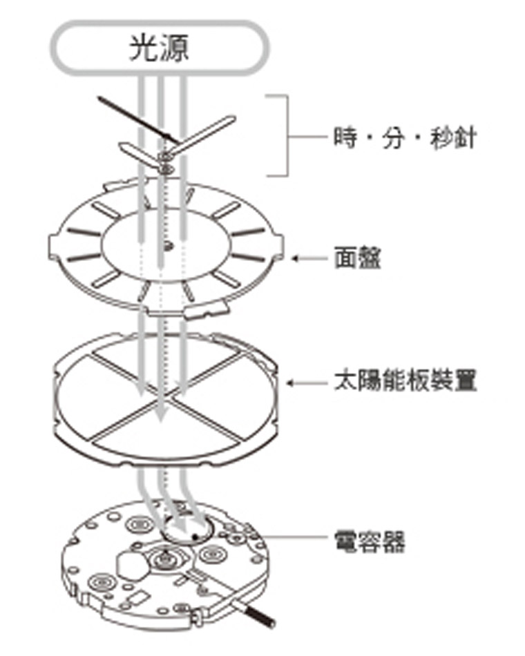 SEIKO的太阳能表款简单来说是靠着光能驱动,SEIKO在面盘下方设置了一枚太阳能板,只要它接收到光源,太阳能板装置会自动将光源转换为电力,并将电力储存于电容器,就像是一个会自动补充电能的电池般,进而不断提供手表电力。而且这种太阳能电容装置不同于一般鋰电池及按压式电池只能使用一次,藉由光源转换成动力的电容器可重复充电,对环境的影响相对也比较低。