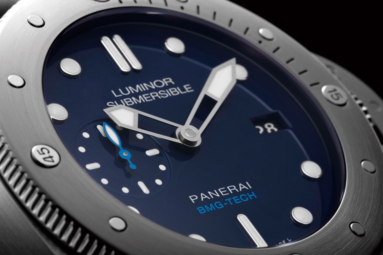 沛纳海另一焦点材质莫非BMG-TECHTM金属玻璃材质莫属,2017年这款材质用于Luminor Submersible 1950 BMG-TECHTM PAM00692上问世。金属玻璃材质不但可以高度抗腐蚀、无比坚固,还能抵御外来冲击及磁场,更能为佩戴者带来意想不到的惊喜。说明一下,这一创新材质的奥祕并不在于貌似钛金属的深灰色外表,而是在于其原子结构所带来的特质。这一创新材质不仅具备出色的性能,同时也具备时尚前卫的设计,造就高级运动制表业的经典。