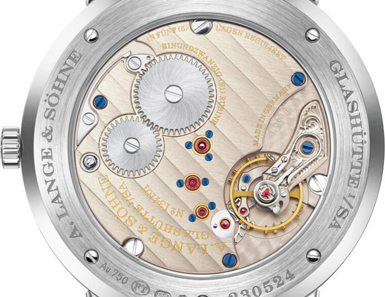 表款的超薄特性来自于朗格打造的L093.1手上链机芯,毫无疑问它是现代朗格最薄的一枚机芯,品牌是在2011年首度推出这款超薄机芯,机芯尺寸包括直径28mm和厚度2.9mm,在朗格作品中都是相对纤巧的设计。在着迷于砂金石面盘迷人美态之餘不妨翻面欣赏一下透明底盖下的机芯样貌,它的3/4夹板经过格拉苏蒂菱纹修饰,外露的冠轮与棘轮表面则有弧形放射纹点缀,同时一些朗格表的工艺特色如蓝钢螺丝、黄金套筒与摆轮夹板雕花等,L093.1一样都不少。而擒纵系统又可以视为L093.1机芯的精华所在,它不光只是具备炫目的雕花夹板,其所採用鹅颈式加上螺纹微调系统则是能够将腕表的精准度调整到极佳准确度状态。此外传统朗格机芯动力储存空间稍感不足的议题也在这枚机芯上获得了改善,品牌採用更扁平并经过优化的单发条盒,能输出足足72小时的动能,就佩戴实用性而言又有加分作用。