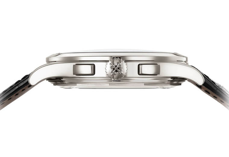 ▲按把採用方形设计,这点从5070开始就一直如此;由于历代130当中有方形按把也有圆形按把,也无所谓哪种比较古典。因为是手上链,所以表冠维持了一定的尺寸方便上链。