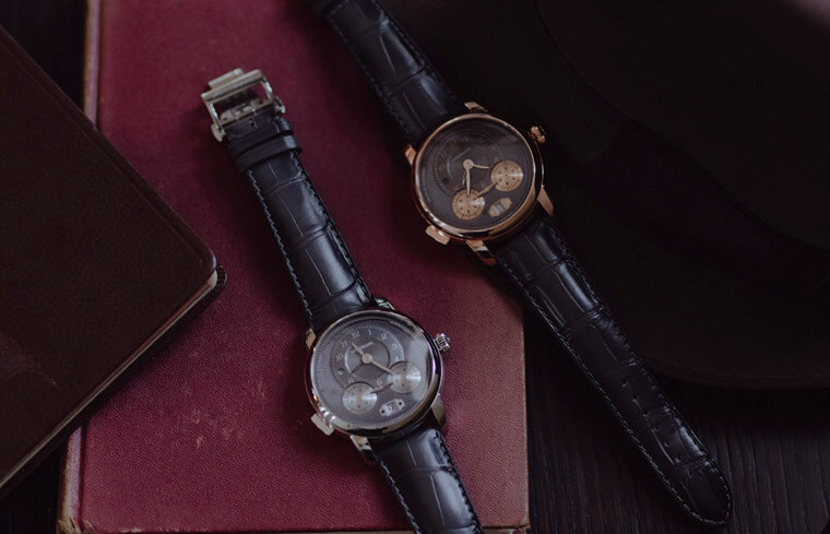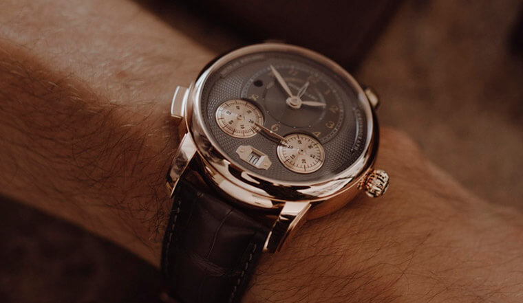 表款在12点方向设有一枚偏心表盘,中轴的第三根蓝钢指针作为两地时间指示之用,而9点方向则开有第二地时间的日夜显示,佩戴者因此不容易混肴第二地时间的昼夜之别,另外4点和8点方向设有前面提过的计时小表盘,加上6点方向的日期窗,整合成Nicolas Rieussec计时码表的显时格局。仔细欣赏表款的面盘,还会发现它的层次感相当丰富,例如面盘外缘与内圈的扭索纹饰有着高低层次,而更内部的偏心表盘屿计时表盘也微微突起,与扭索纹面有所区隔,同时偏心表盘和计时表盘本身也带有高低差层次或是同心圆纹装饰等,让这灰面看起来格外具有吸引力。