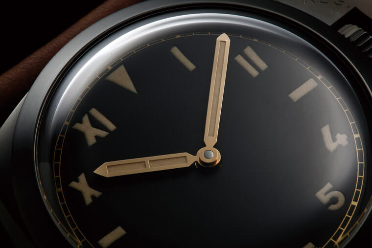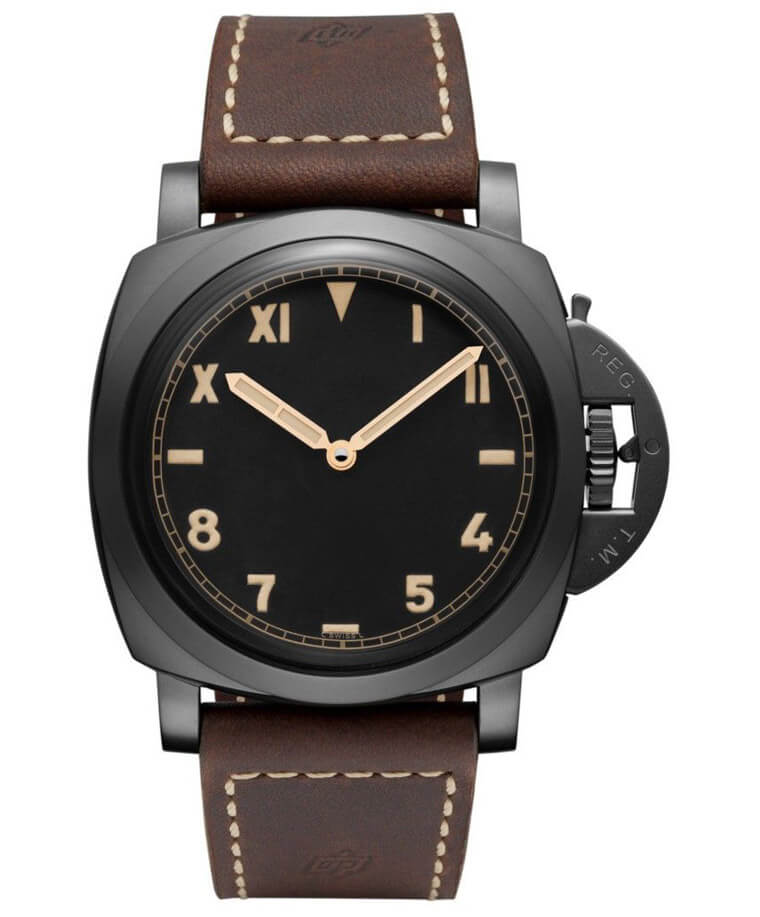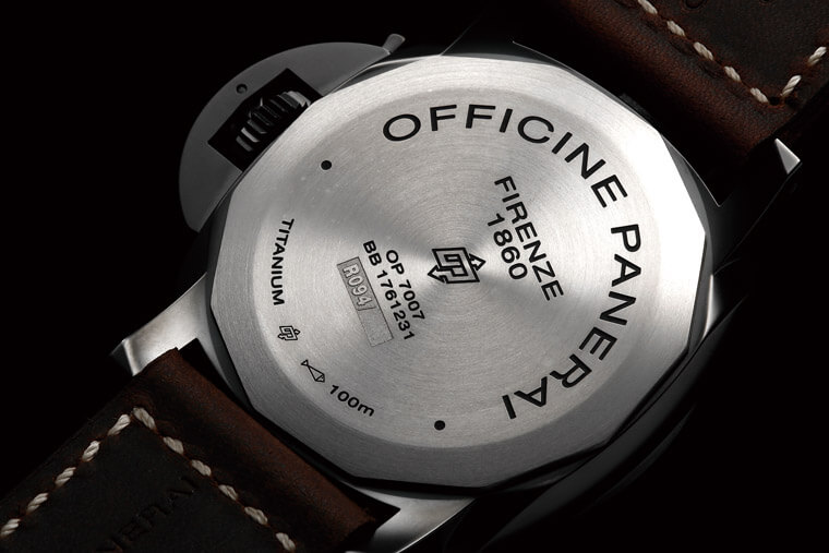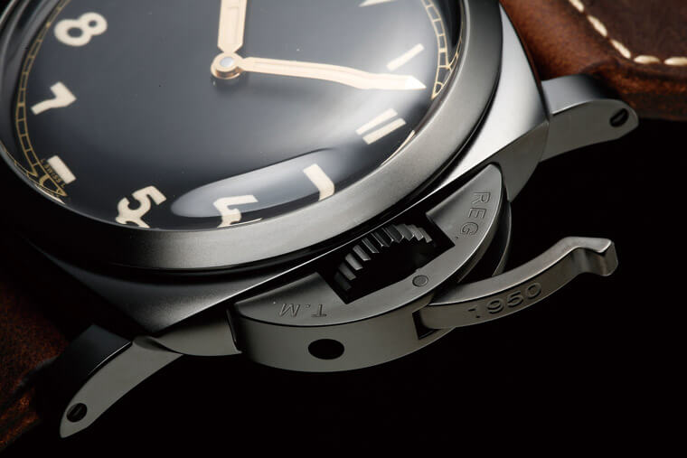 本次介绍的Luminor 1950 3 Days Titanio DLC(PAM00629),搭配以轻巧、耐磨、防刮为名的钛金属材质表壳,再经DLC(类钻碳)涂层处理,呈现酷黑的型格意象。且品牌于表冠护桥装置上鐫刻"1950"年份,代表着Luminor 1950系列。