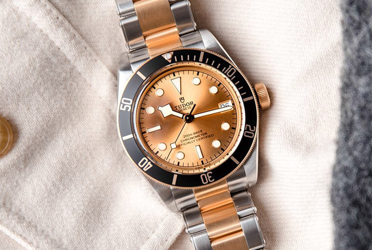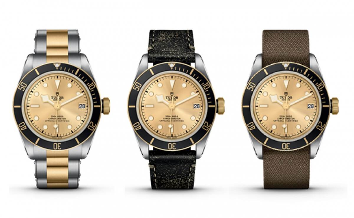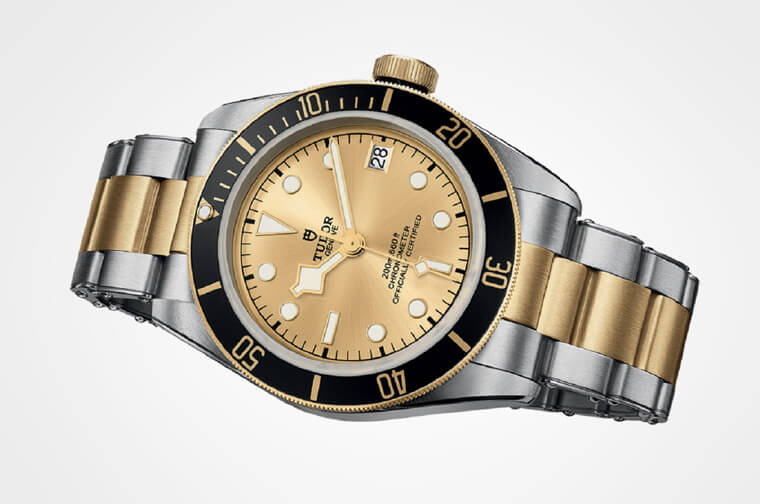 TUDOR近几年的绝对主力Black Bay系列,设计上的特徵如招牌雪花针搭配几何夜光时标,尤其六点钟位置所做的防水深度与认证标记,更是在自家面盘上增加了不少细节化的质感,搭配十二点钟位置的盾牌Logo,都是能让人留下印象的鲜明DNA。有别于去年半金款採用的黑面,今年改成金色面盘后整体显得比较高调,这点搭配皮表带或织纹表带时更明显,若觉得2017年款式的半金黑面有些点到为止,那麼金色面盘的出现刚好可能会是你的解套方案,不过有一点还须留意,因为表款的时标指针还是维持金色,夜光物料也一样是米黄色,所以配在面盘上可能对比度就没有和黑面搭配来得那麼锐利。