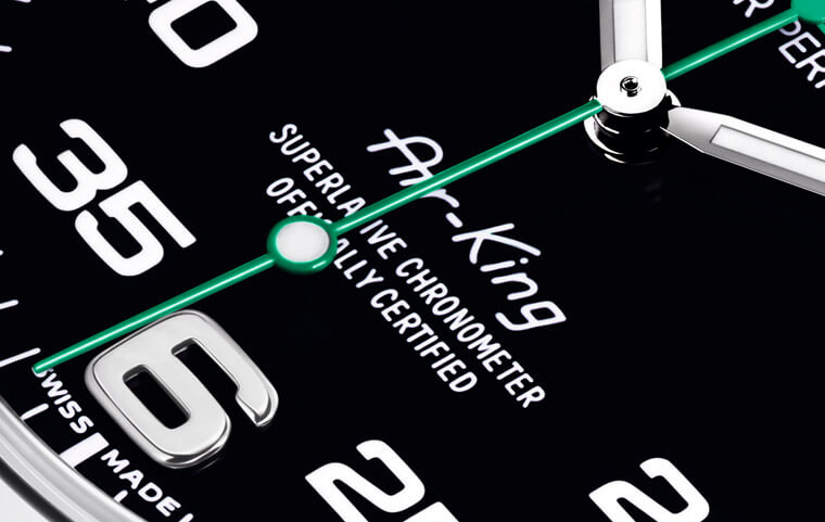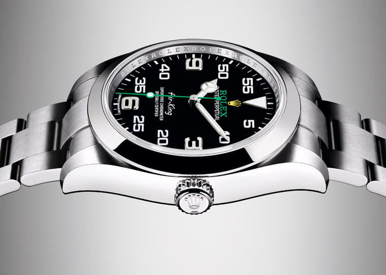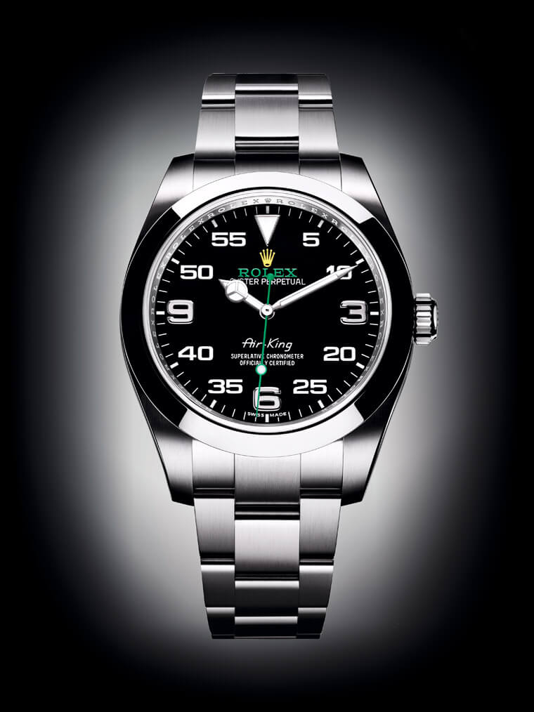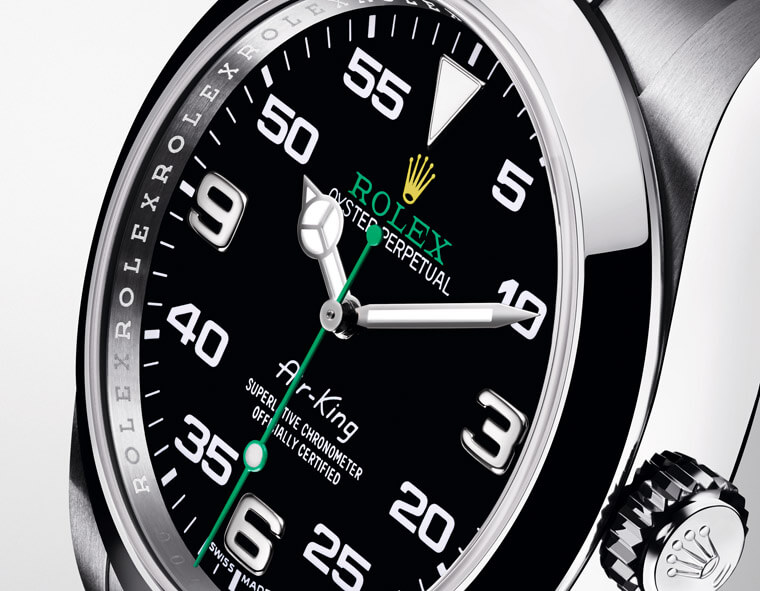 2007年以后Air-King开始具备C.O.S.C.天文台认证,这次的改款刚好赶上了劳力士将旗下产品全面升级到自家的Superlative Chronometer顶级天文台认证,因此同样也拥有了装壳实测的超高精度。复古的Air-King字体是这系列一脉相承的迷人特色,除此之外,这次新款还採用了绿色秒针、绿色ROLEX字样和鲜黄色的皇冠,这些都是过去罕见于劳力士的新鲜元素,凡此都为表款在消极的区隔之外增添了独一无二的魅力。