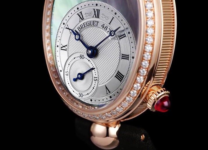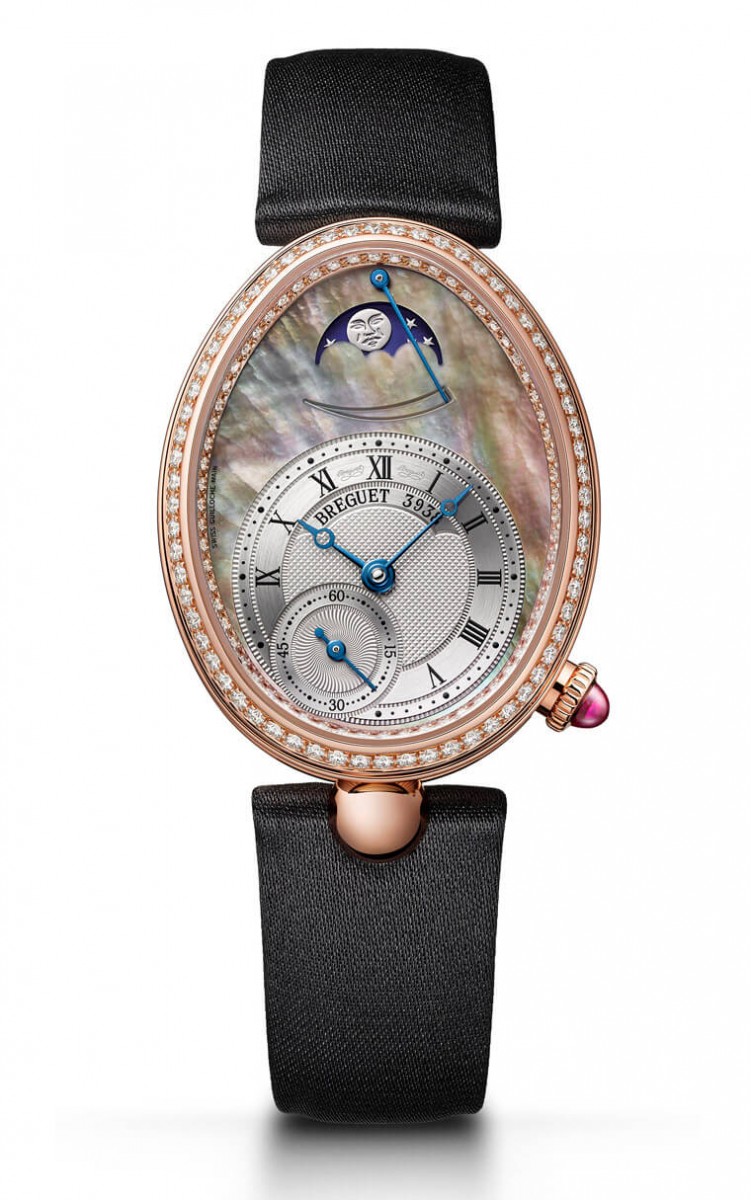 Reine de Naples 8908採用玫瑰金表壳,宝璣更在表圈以及表壳内缘镶上128颗美钻,表冠上镶有一枚0.27克拉的红宝石吸引目光,就连球形表耳也额外增添了双层设计,令人感到耳目一新。面盘使用大溪地珍珠母贝加以装饰,其原本偏深色系的色泽经过光线照射后更能反射出多变色彩,而在面盘下半部的银质偏心表盘、小秒盘等处更加码施以宝璣着名的机刻雕花工艺,包括时、分针与小秒针也都经过蓝钢处理,在银白色表盘的衬托下显得清晰易读。12点方向设置的扇形月相窗愈靠近满月愈能露出月亮图案的全貌,宝璣精心在月亮图案表面刻上人脸轮廓,比起一般只採用拋光修饰的月亮图案更有「人味」和意趣。