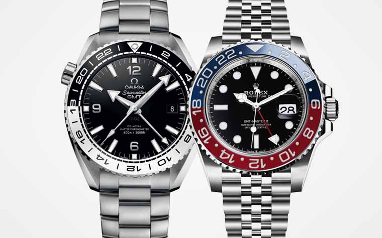 陶瓷表圈技术在近十年来慢慢变得成熟也更普及了些,比较早期阶段我们最常看到的就是黑色陶瓷圈,而在后来也开始出现其他顏色的陶瓷圈,例如蓝色、绿色或棕色等等,一方面发挥陶瓷耐刮抗磨损的特性,另一方面陶瓷强调永不褪色的特性再加入更多顏色选项之外又变得更讨喜许多。至于劳力士在2013年发表的GMT-Master II算是一个里程碑,因为它让陶瓷圈多了「双色」这种设计,无论是当年的蓝黑圈,再到这一两年的百事圈,劳力士在陶瓷表圈技术的研发上算是表坛中的先锋。当然目前陶瓷圈做得有声有色的品牌不只劳力士,欧米茄也是其中之一,他们家除了也研发出多种顏色的单色陶瓷圈,也不遑多让制作出双色陶瓷圈作品,甚至欧米茄对于陶瓷圈上的刻度也很讲究,像是Liquidmetal和Ceragold等都是他们独家的陶瓷圈金属刻度。本次我们就来欣赏看看两家陶瓷大腕旗下的双色陶瓷圈腕表,巧合的是,它们的功能同样是GMT,原厂定价也还满接近的,对于喜爱进阶陶瓷圈设计的人士,这两款都会是早早锁定的口袋名单。