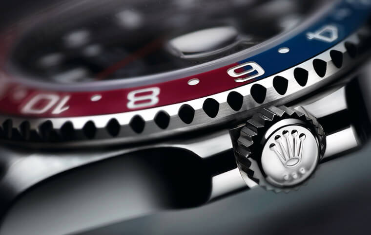 焦点回到这款126710BLRO身上,蚝式钢是系列从第一代就开始运用的材质,拥有诸多优点,包括质地坚硬、防震、防水性佳等,与此系列关系深厚,是品牌具代表性的设计元素。而外圈和字圈在制作上同样不简单,劳力士为了数字和刻度能够清晰阅读不停研发,2005年开发出创新技术,用陶瓷取代铝金属来打造一体成形表圈,并以Cerachrom一字註册商标,再以PVD技术镀上一层铂金,防刮损也防紫外线侵害褪色。当表圈处于三角形标记指示的12点钟位置时,24小时红色指针便能指示家乡地时间,可从与其相对的表圈刻度来读时。