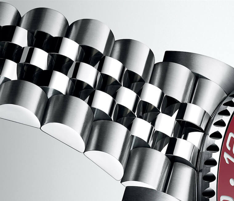 ▲钢壳百事圈GMT-Master II搭配的是五链节纪念型表带(或称五珠带),表带配有劳力士于1966年获得专利的易调链节,此延展装置让佩戴者可延长表带约5毫米,在任何情况下佩戴都倍感舒适。