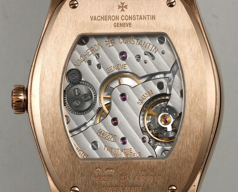 这款小三针初出时堪称是全系列的定番,因为往上就是陀飞轮,往下则是石英款,相形之下这款机械小三针应该是大多数都会优先入手的选择。表款搭载4400机芯,包括另一款两针的铂金限定版在内,两款装了4400机芯的款式在一推出时都没採用透明底盖,直到2014年才将小三针款改成看得到机芯的样式。对于像江诗丹顿这种每只表都有取得日内瓦印记的品牌来说,不做透明底盖实在是一件很可惜又很稀奇的事,而当初他们之所以一度选择将底盖封起来,主要的理由应该还是考量到表壳是酒桶形的,但机芯却是圆形的。事实上酒桶壳装圆形机芯无可厚非,毕竟酒桶形的机芯直如凤毛麟角,强求不来,不过当时江诗丹顿还是选择了慎重其事,寧可不露也不要让机芯和表壳间稍有齟齬。
