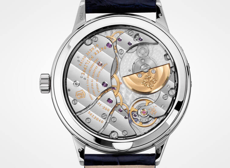 31-260机芯的发展其实与三针一线的配置有莫大关系,原本品牌经典的240机芯是不二人选,不过其位于五点钟位置的独特小秒盘不太合乎三针一线的标准,但PP着眼于其2.53mm的纤薄厚度为基础,誓言制作一枚可作为三针一线表款所用的机芯。对此,品牌在维持厚度不变的前提下,制作超越240机芯的超薄自动上链机芯就是最大挑战。此外,相较于240经典机芯更增加停秒装置、採用较厚微型自动盘提供更佳上链动能,厚度也不过仅增加0.07mm,机芯尺寸更是放大到31.74mm,在当年市场偏爱表径放大的风潮下更能避免小机芯装入大表壳的窘态。品牌制表团队还重新设计了发条盒与擒纵器间齿轮组的轮齿形状,进而增加咬合并减少摩擦,使动力储存较240机芯多出四分之一,虽然是单一发条盒却能达到60小时。而震频也从240机芯的每小时21,600vph提升至23,040vph,每秒震动从3Hz提升到3.2Hz,据PP的说法能够符合PP印记的标准,将精准度调校至日差-3/+2的范围。