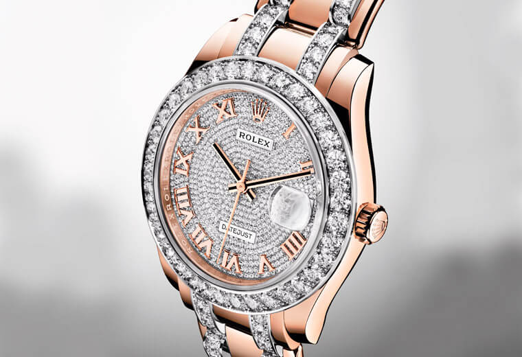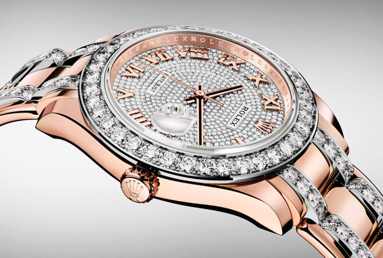 ▲Pearlmaster的面盘上共镶有713颗钻石,搭配表圈36颗钻石和表带链结上的144颗钻石,极致奢华,于腕间闪耀光彩。