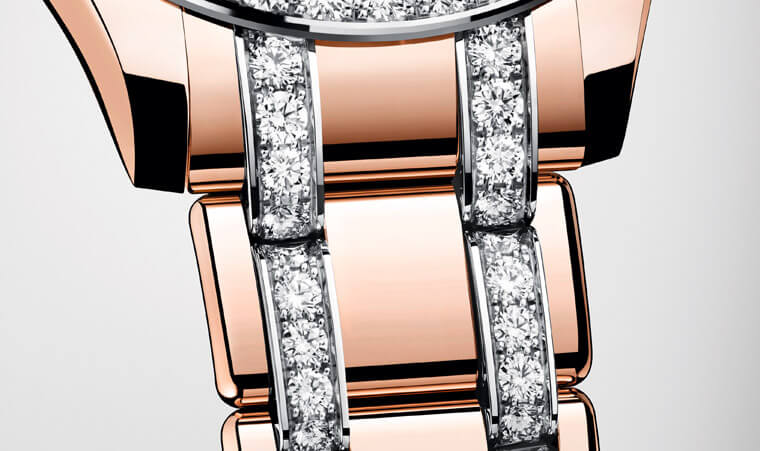 这款86285表壳採用18ct永恆玫瑰金制作,此外品牌连链带也採用18ct永恆玫瑰金制作,链节特别镶上美钻,手工精美之餘,与面盘和表圈上的钻石互相呼应,展示品牌过人的钻石镶嵌工艺。不过Pearlmaster 39不只是华丽耀眼而已,它的蚝式表壳具有100米的防水性能,品牌具有特殊工具能将三角坑纹底盖旋紧,使表壳密封,因此只有劳力士自己人才可开启底盖直探机芯。而表冠亦具备双扣锁双重防水系统,牢固旋紧于表壳。这种防水等级放眼一般珠宝表,还真没几个对手能够匹敌。