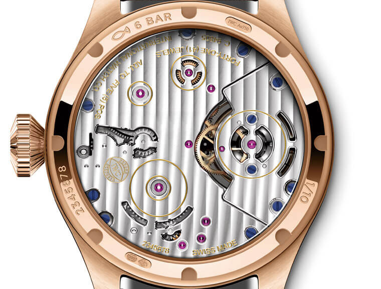很多人第一眼看到温柔光泽的表壳顏色,就以为是玫瑰金表壳,事实上这是IWC近来新开发的新合金「硬金」,此表也是品牌首次使用这样的特殊新型态金属。藉由调整了贵金属的成分,微结构在复杂的制造过程中改变,让金属能够在带有玫瑰金色泽的前提下,一举把抗磨损能力提高到传统玫瑰金的5~10倍以上,成为制作大型飞行员腕表硕大表壳和表冠的绝佳材料。