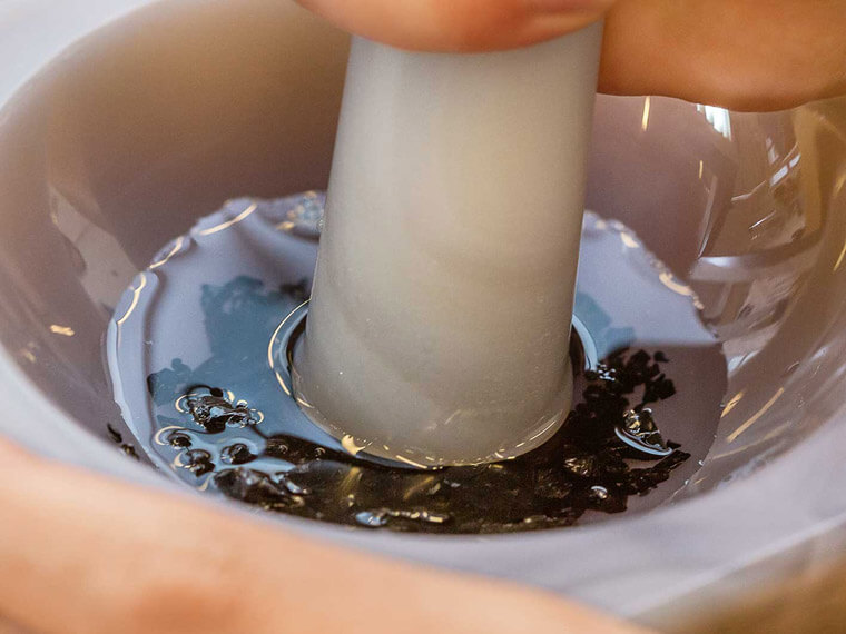 首先以一种特制玻璃作为基本原料,放进研钵内研磨,压成细小颗粒,接着再以刷子抹湿。