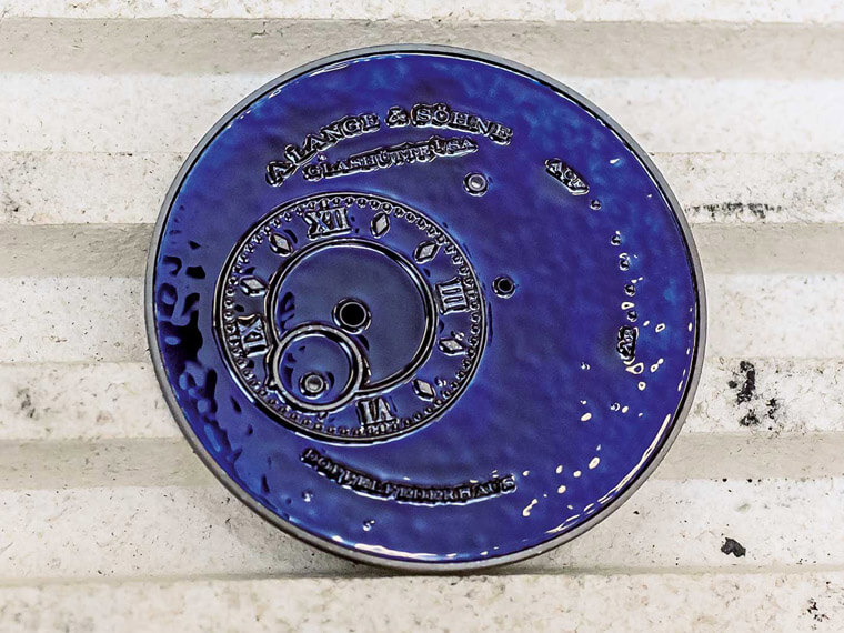 註:通常我们看到的黑色珐琅面盘,它的原料其实不是黑色珐琅颗粒,反而是蓝色珐琅颗粒,这是因为珐琅涂层反覆涂抹、烧制后,顏色会愈变愈深,直到它完全变成黑色、表面也都确认过没有瑕疵或裂痕后,一枚黑色珐琅面盘才算制作完成,而通常这就是几天以后的事了。