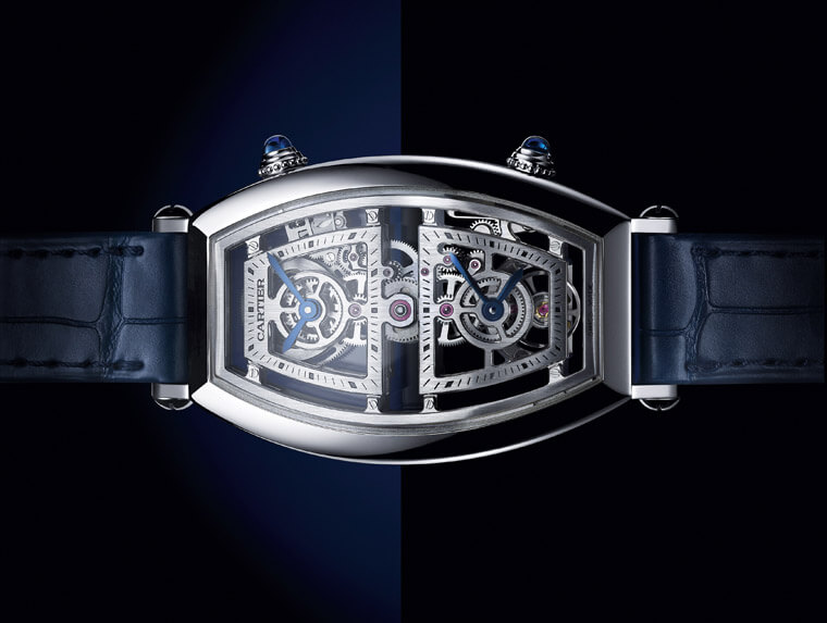 Tonneau双时区镂空腕表搭载9919 MC机芯驱动双时区装置,为了适应腕表本身的弧形表壳,机芯结构经过修改并同样呈现弧拱造型,整体齿轮在发条盒和擒纵齿轮上弯曲。为了确保腕表的修长造型,齿轮系全都均设于12点和6点之间。卡地亚为了追求美学的艺术杰作,还打破了传统两地时间的显时方式,Tonneau双时区镂空腕表刻意让两地时间各自佔据面盘的上下两半,令判读时间立即一目了然。表款的表壳看起来像是拥有两枚表冠,事实上2点方向的是传统的表冠无误,而在4点方向同样镶有蓝宝石的装置则是一枚按把,功用就是它会与6点方向小表盘的时针连动,按一次按把,则第二地时间的小时就会向前推进一小时。总之,两个时区装置相连,带来兼顾实用美观的奇观,读取时间更加简单。值得一提的是,9919 MC机芯虽然是手动上链机制,动力储存却至少有60小时,超过两天的便利性,更加体贴佩戴者。
