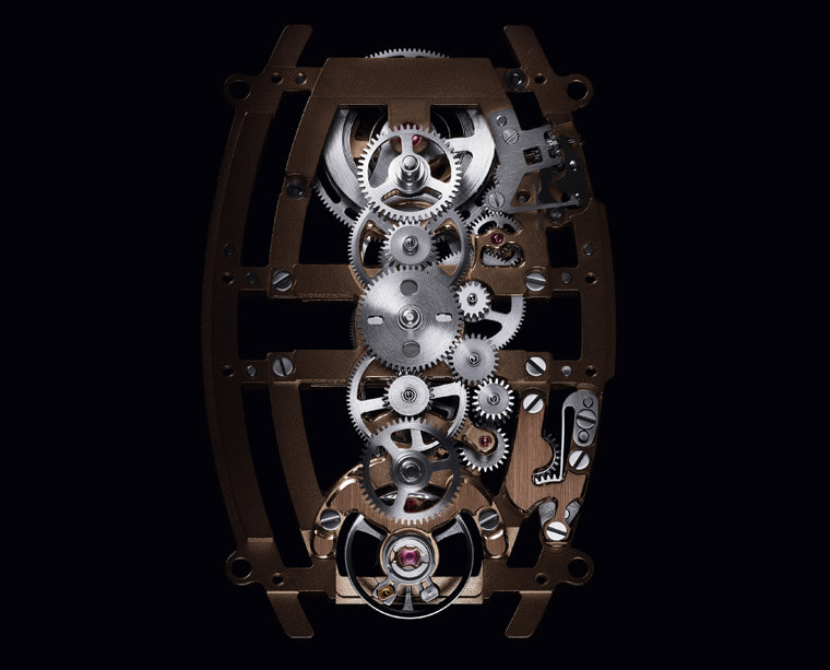 ▲为了确保Tonneau双时区镂空腕表的修长造型,齿轮系全都均设于12点和6点之间。