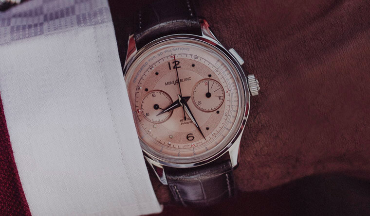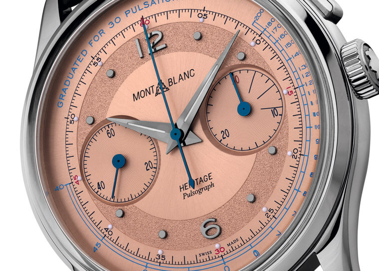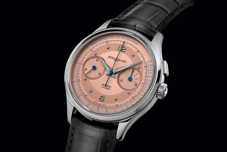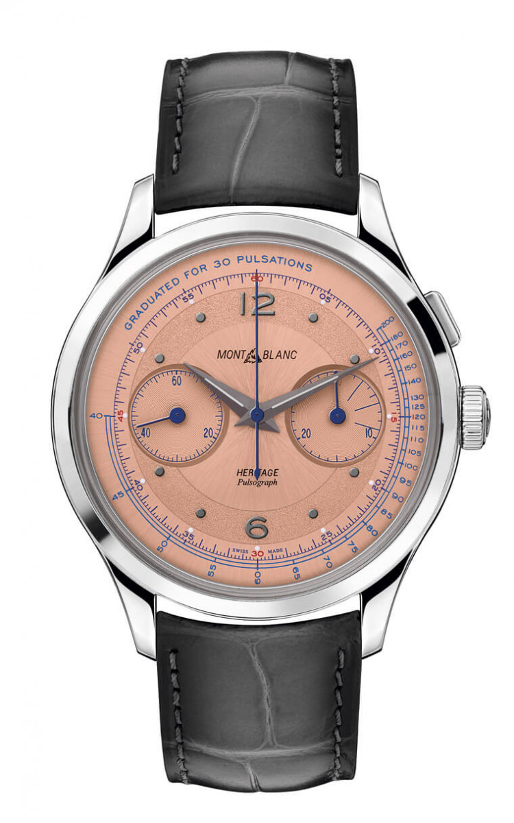 在过去只有怀表的时代裡,医护人员使用三针显示的时计测量脉搏,计算病患15次的脉搏次数,数值乘以4后得出每分钟的心率。1920~1930年代出现了将脉搏计刻度置于计时码表面盘的设计,只要启动计时,默数病人脉搏跳到第30下再停止计时,让推算更加精确。而从一般时计秒针的自然走时转入脉搏计刻度,自然也与计时码表的发展有重大关系。万宝龙Heritage传承系列自制机芯脉搏腕表限量款100,就是一只灵感源于收藏家们所称的医师腕表。