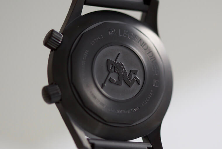 在复古外观下,Legend Diver搭载的是跟浪鬼一模一样的L888.2自动机芯,包括21颗红宝石、摆轮震频是比较少看到的3.5Hz,加上超过二日链的64小时动力储存,这点确保了表款不只是一味仿古,在手表性能以及品质表现上都能跟上现代水准。为了捕捉早期潜水表的风格,同时也是要巩固自身的防水性能,表款採用了旋入式实底盖紧紧包住机芯,底盖内圈刻有一名潜水员图案稍微装饰,不过底盖这边也同样经过PVD处理,所以手表正、反面看起来都是一片黑。至于它的防水性能——300米属于潜水表的普遍水准,看起来并不特别出色,但这种水准用来应付日常生活的戴表情境绝对绰绰有餘。