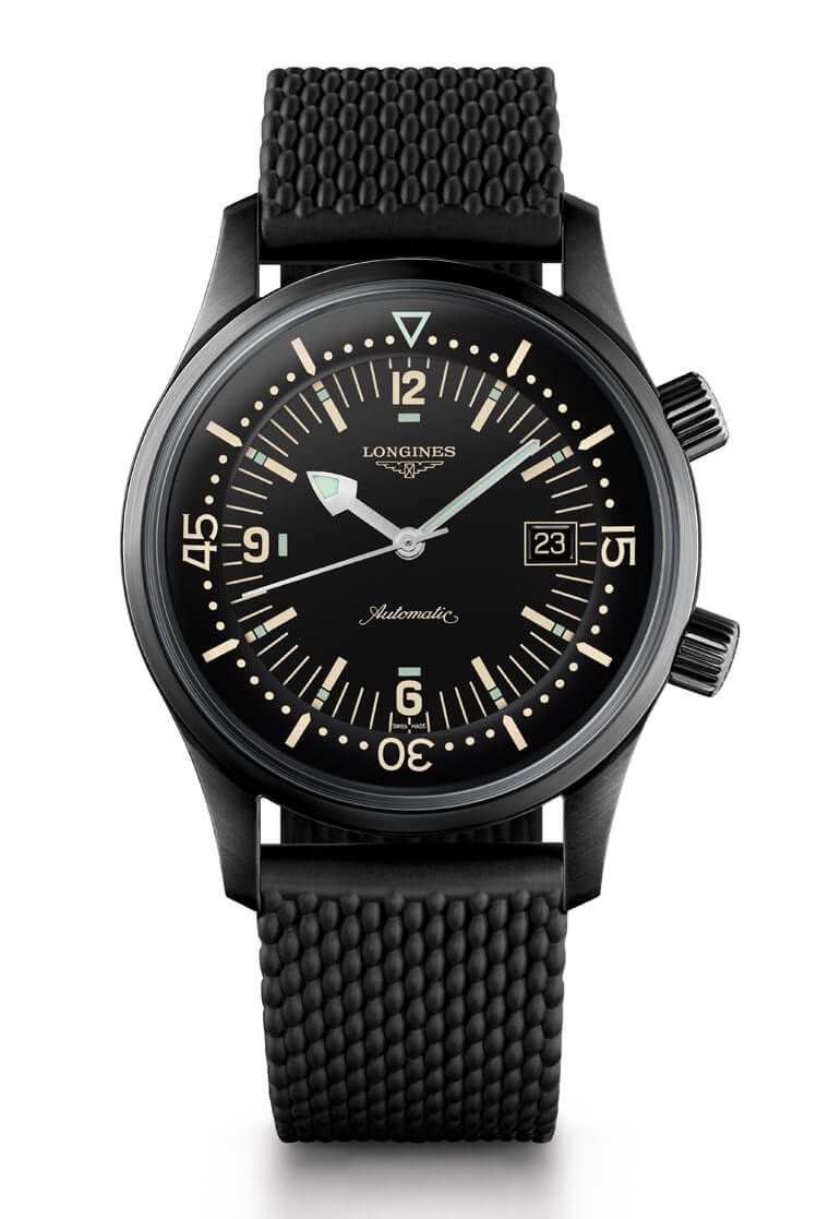 LONGINES浪琴潜水表这两年随着浪鬼HydroConquest深海征服者系列推出陶瓷表圈,又再次炒热了市场的人气,原本深海征服者系列就已经是颇有口碑的入门级潜水表之一,在加入陶瓷圈后,整体的品质和水准又再向上提升了一些(虽然入手门槛也跟着拉高了⋯⋯);不过除了HydroConquest系列之外,浪琴也还有另一支比较低调的潜水表产品线,那就是Heritage的复刻潜水表,这系列不纯然是潜水表的家族,举凡正装表、飞行表、军表、潜水表等应有尽有,如果说HydroConquest是浪琴现代潜水表的代表,那麼Heritage自然就是喜欢复古风格的人寻找潜水表时不容错过的选项之一。2018年品牌推出了Legend Diver复刻潜水表的改款,延续前一年度的复古设计,但是表壳改成PVD处理,以全黑的造型崭新登场。