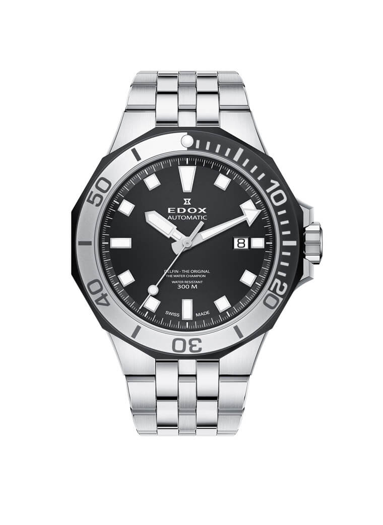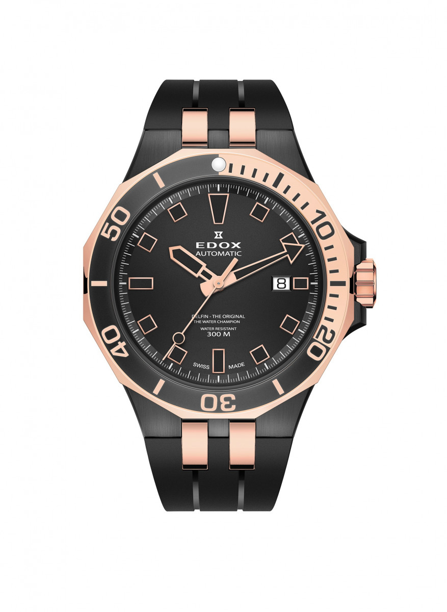 2019年二月刚新推出的Delfin海豚系列自动日期腕表,十二边形表圈设计,搭载SW200自动机芯,经典的复古表壳造型保留原创精神,,背盖上鐫刻水上冠军的标志。海豚系列有特殊设计的强化双层防水后盖,并拥有专利的双胶圈表冠系统和在机芯及表壳间加强防撞保护垫具有坚固的防撞击能力且防水可达300米,超强夜光及可计时潜水表圈,沿袭之前的强悍性能,即使在深海高压的环境中也能顺利运行。
