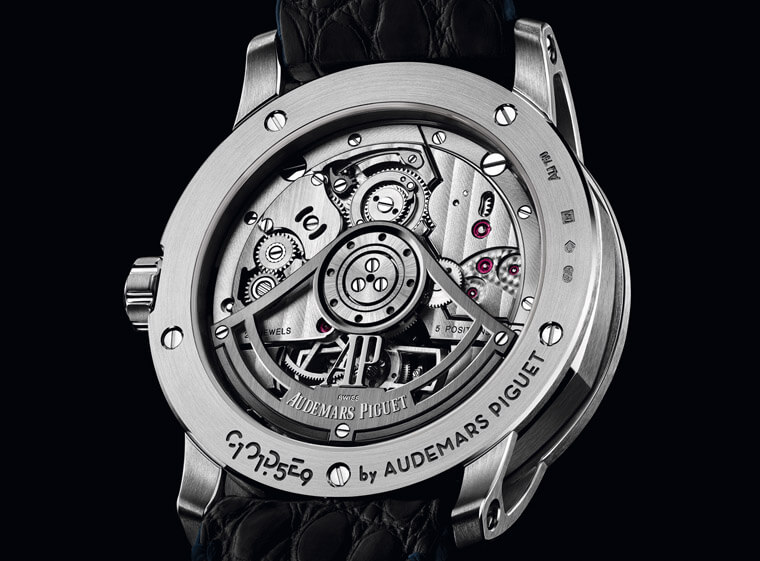 此表搭载品牌自制2950自动上链机芯,动力储存可达65小时。再次强调这是爱彼首次在自动上链机芯中配备中央自动盘与飞行陀飞轮。高端精修向来是爱彼时计的精髓所在,然而机芯上的高复杂精修工艺如缎面拉丝、倒角与拋光等处理手法,皆使表款外观更加出众,机芯的表面一侧则饰有珍珠圆纹与圆形缎纹,机芯的底盖一侧则饰有日内瓦波纹、蜗形纹以及手工拋光倒角斜面,可从底盖透视的镂空自动盘与表壳的顏色相呼应;玫瑰金表款搭配玫瑰金自动盘,白金表款则搭配銠色调玫瑰金自动盘,让表背也有协调之美。