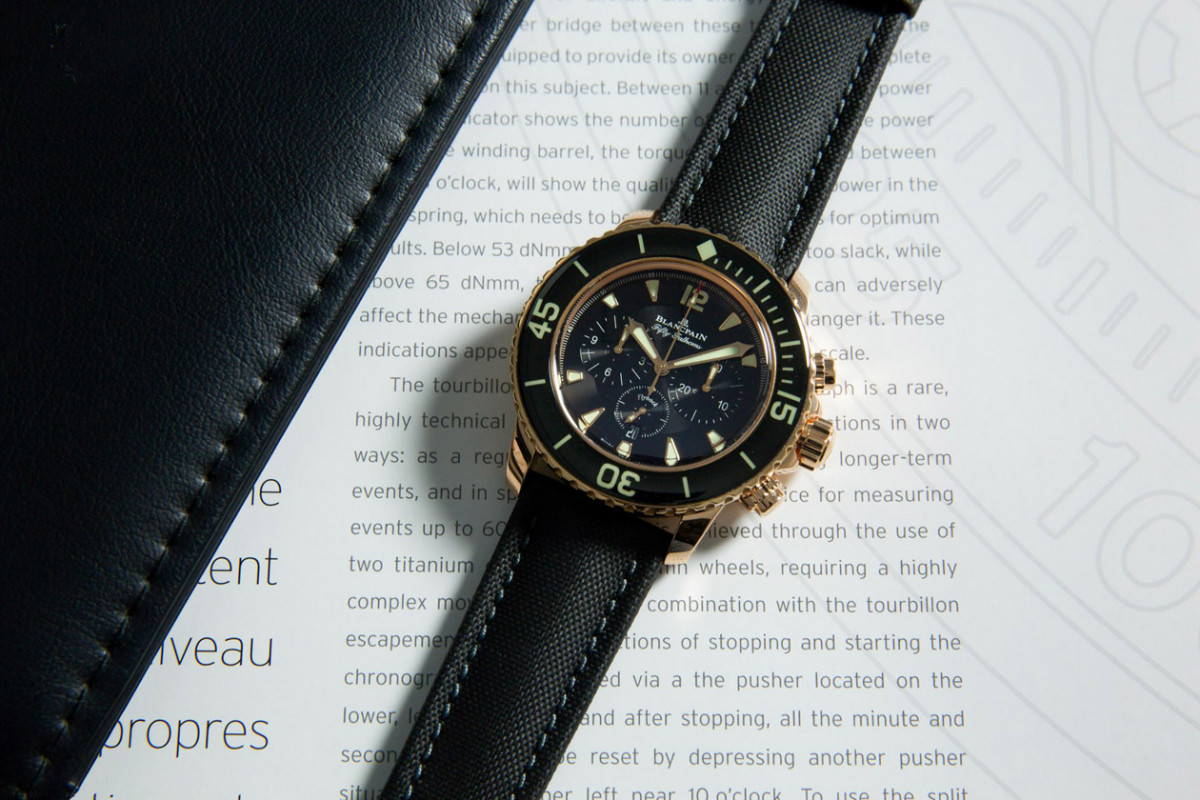 BLANCPAIN宝珀旗下经典表款众多,动静皆宜的表款中又数Fifty Fathoms五十噚潜水表系列为人所知晓。自1953年开始因军事所需诞就世界第一只五十噚潜水表后,除了至少300米防水深度规格外,因应时代与日常生活所需,宝珀五十噚潜水表致力不懈赋予腕表各种不同功能组合。诚如本篇介绍的宝珀五十噚飞返计时腕表(Ref:5085F363052A),不只颠覆坊间多数潜水表採用不锈钢材质的刻板印象,腕表具备飞返计时功能和搭配奢华玫瑰金材质组合,让人印象深刻。