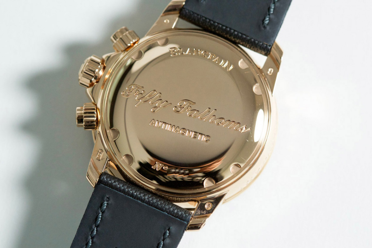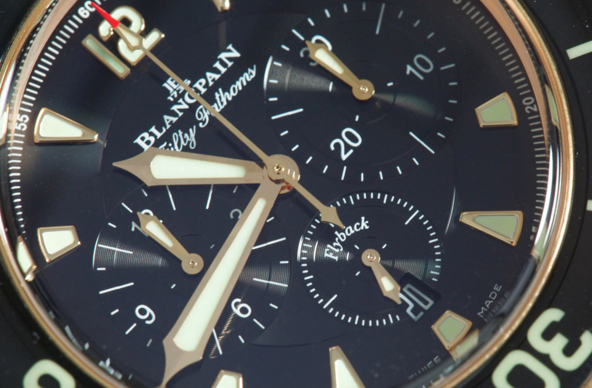 宝珀五十噚潜水表系列中具备多款不同功能组合的腕表,从简单三针日期、GMT、陀飞轮、月相、万年历功能一应俱全,诚如前面所提到的,潜水表在后期已不再单纯属于潜水员的专属配备。本篇介绍的这只五十噚飞返计时腕表虽称不上五十噚潜水表系列中功能最复杂的表款,但其飞返计时功能确实给予极大的便利性。普通的计时码表为了连续测量多个时间段的长度,佩戴者必须连续按压按钮三次:一次用于停止计时码表,一次用于将其归零,一次用于再次开始计时。而配备飞返计时功能的腕表,按压「飞返」按钮一次即可停止记录第一段时间,同时将指针归回零的位置。在松开按钮后,计时指针立即再次开始运转。这项复杂功能可以节省操作时间,比起普通计时码表,飞返计时不但降低了因多次操作的损耗,更可以迅速精准地计时,对佩戴者来说便捷又节能。
