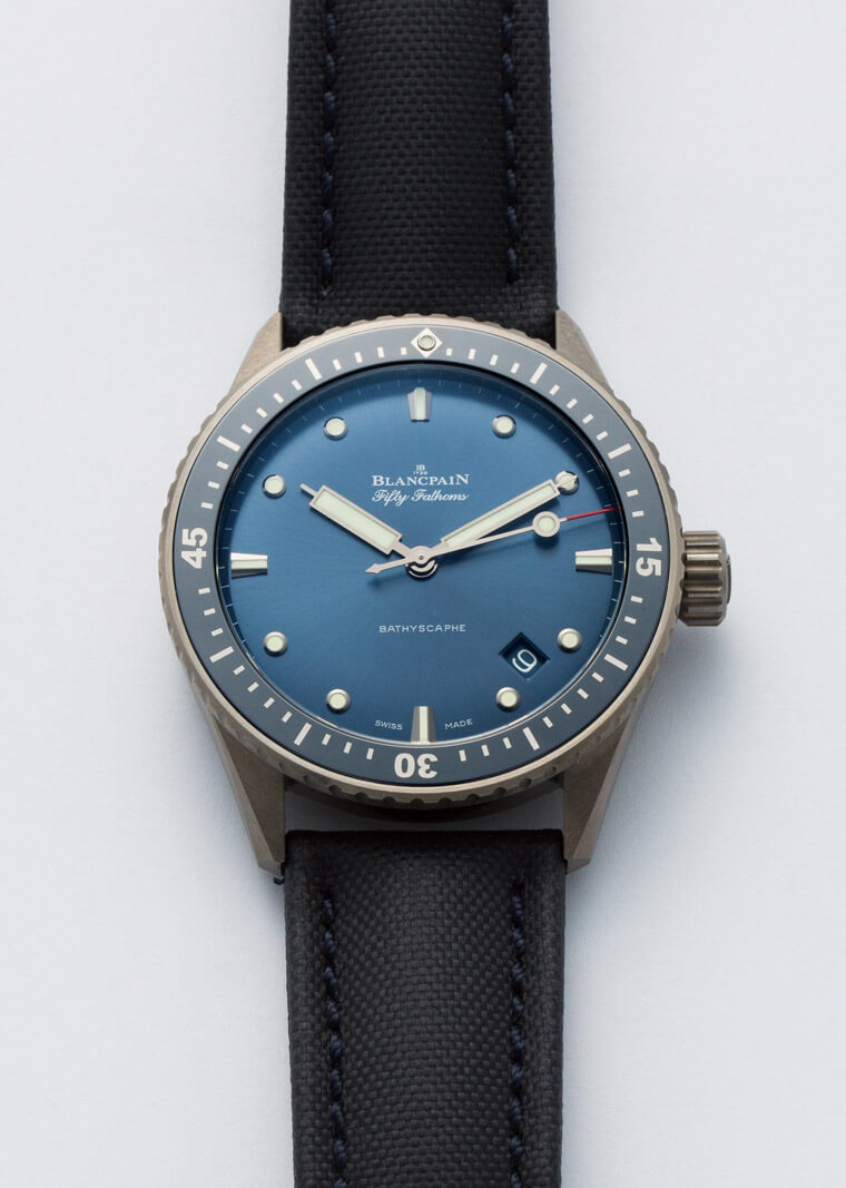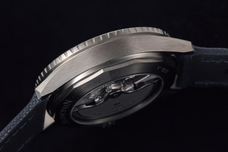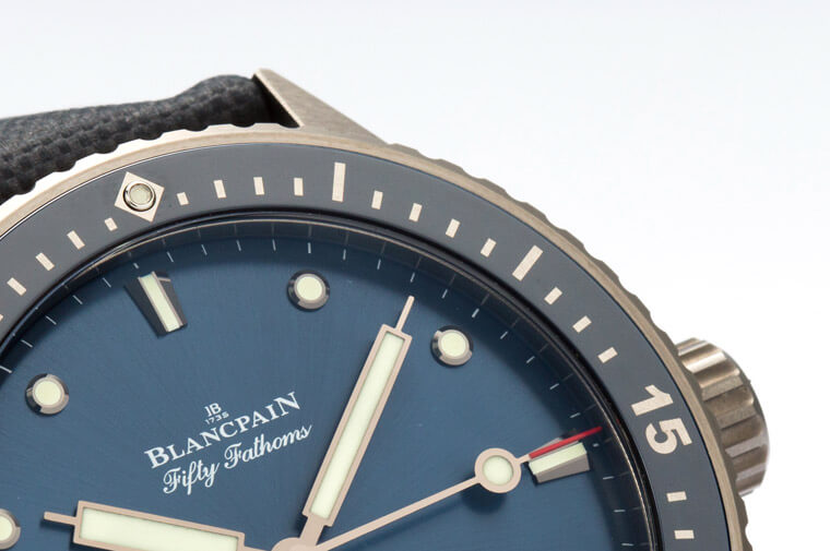 BLANCPAIN宝珀的五十噚Bathyscaphe从初期的款式就包含了陶瓷版本,不过当时出的是黑陶瓷,灰陶瓷是在那之后先行用在Ocean Commitment纪念版的计时码表上,再隔两年才套用到三针款上头。虽然讲成灰陶瓷听起来好像只是换了一种顏色,但其实这裡使用的是早几年由同集团的RADO率先导入的等离子陶瓷,材质虽然具备了陶瓷的特性,但表面的质感更接近金属,而这款选择了灰色的成色,表面又施以髮丝纹的雾面处理,看起来其实更像钛金属。