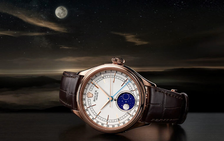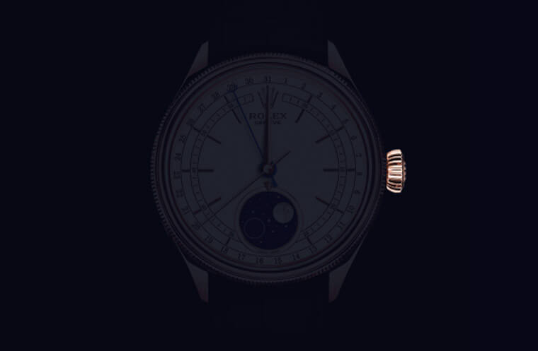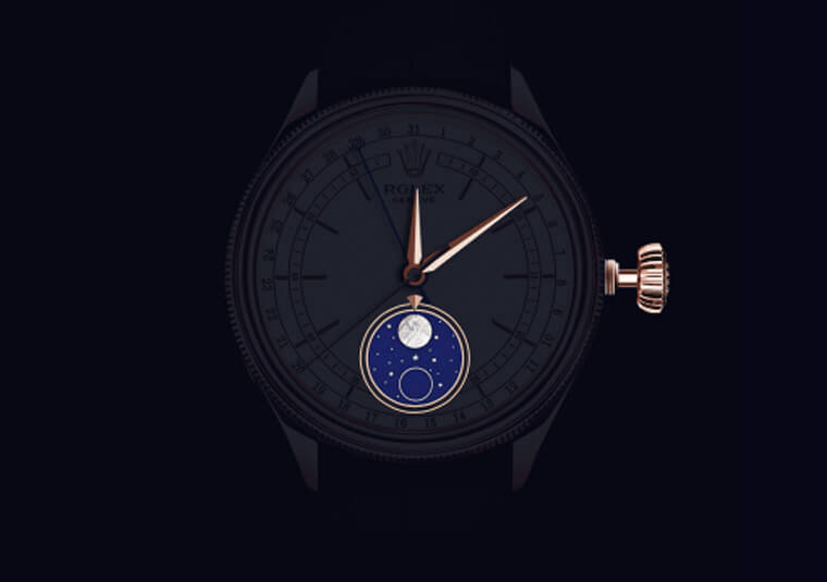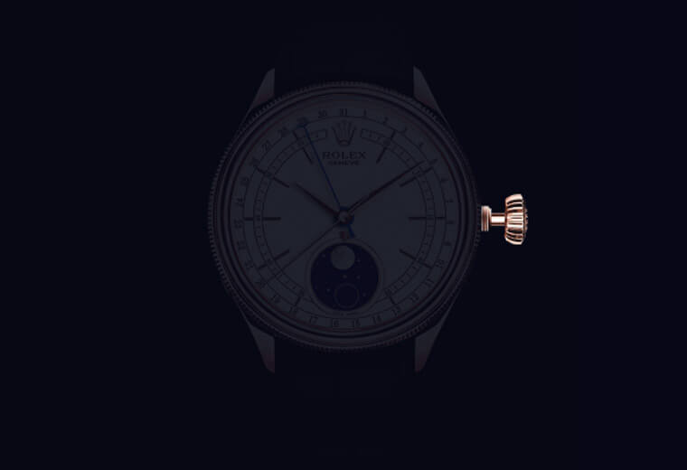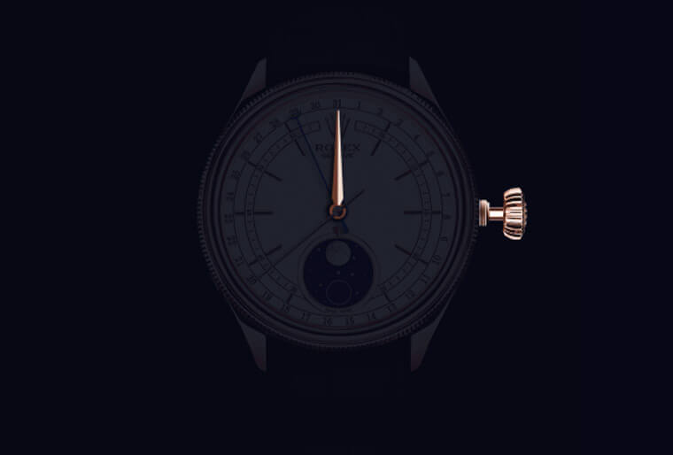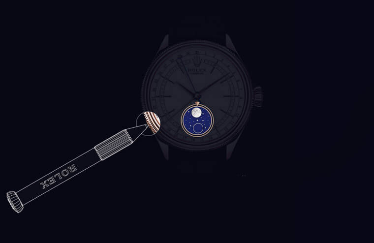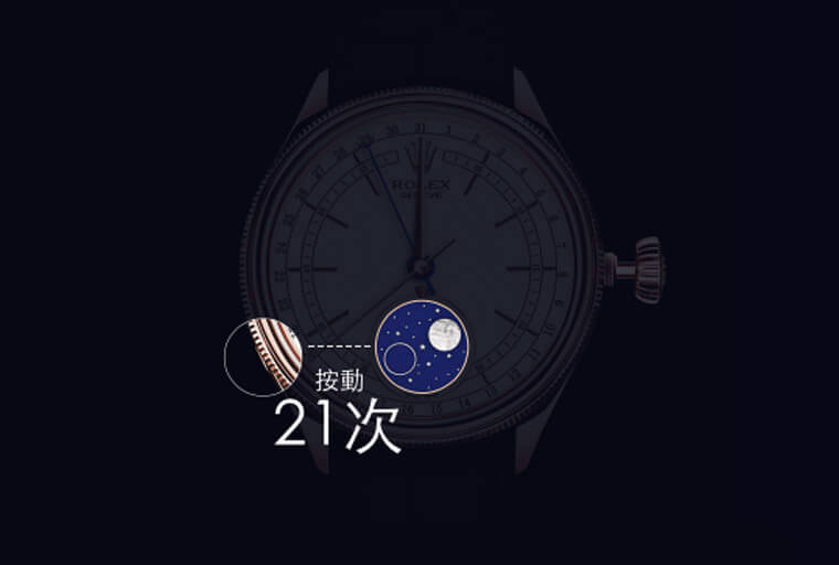 Cellini系列目前功能偏向基础和实用型,包括大三针、日期、两地时间等等,而在2017年时劳力士有点出人意料地推出Cellini Moonphase(50535)这款堪称是这系列甚至是放眼整个品牌旗下都相对特殊的作品,这当然是因为劳力士已经超久没推出月相功能的手表了(精确一点来说,品牌上一只月相表可以追溯到1953年推出的Ref. 6062),而且劳的月相功能也很有自己的特色——面盘六点方向的月相盘採用陨石材质象徵满月,再以银环表示新月,整个面盘则是用蓝色珐琅制作,精致度比起市面上很多月相表都高而且看起来也没那麼阳春。劳力士在Cellini Moonphase的表壳8点方向设置了一枚隐藏式按把,至于这个月相快调装置要怎麼使用呢,以下带你一个步骤一个步骤了解。