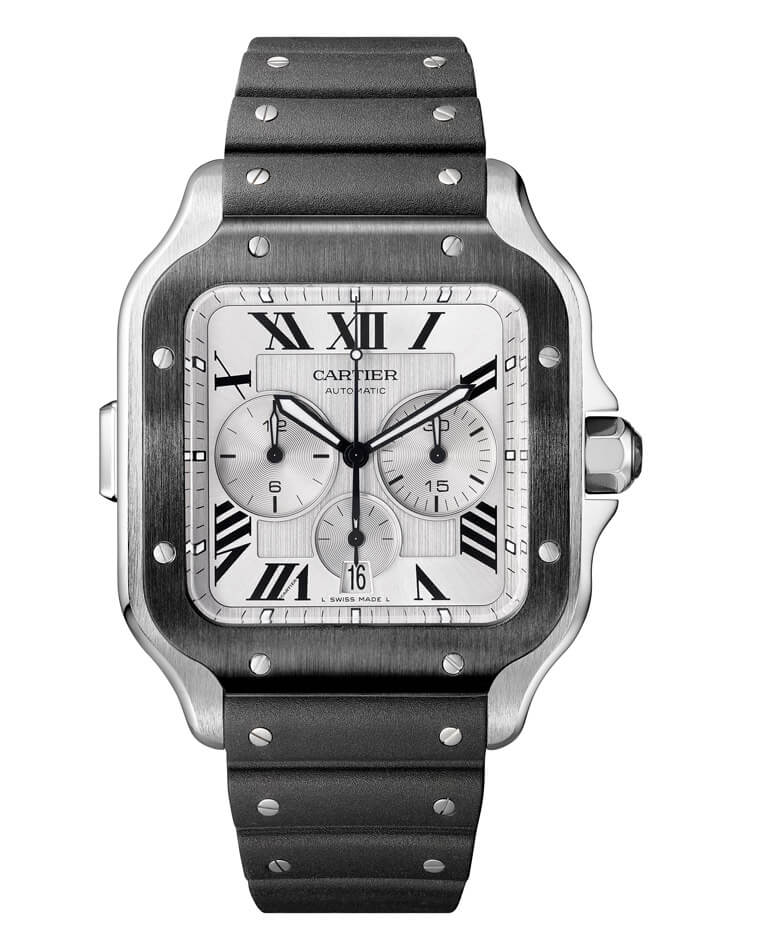 Santos计时码表分别有不锈钢、半金以及玫瑰金等三种材质版本,而且尺寸不像先前基本款分成大型或中型,让人在选择时多少会有点犹豫,这次一口气就直冲43.3x43.3mm的超大型尺寸,展现运动表天生的大气粗獷感。值得一提的是,这次的Santos计时码表不锈钢款在表圈部分特别採用ADLC涂层小小装饰一下,跟三针款纯粹不锈钢的银白色泽比较,看起来会更有层次变化感,