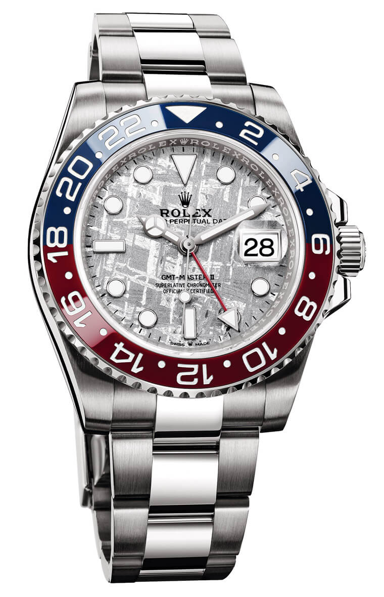 陨石面在劳力士的产品中始终佔有一定的人气,儘管时下的年轻人未必欣赏,但这种特殊素材的稀少性和独一无二仍然受到资深玩家的追捧,而这些玩家正好又是金壳劳力士的主力客层,将它们(陨石面和金壳)结合在一起可以说是相当合理的选项。陨石面不但拥有每块都不相同的独特纹理,另一方面它银灰的色泽之于GMT-Master也是别开生面,历来GMT-Master搭配的都是深色面盘,如此明亮的表面搭上熟悉红蓝圈意外地为这个老经典营造出一种崭新的印象。