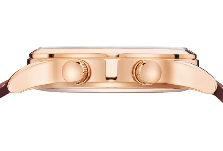 ▲左侧的按把是这款最重要的机能性所在,按把的尺寸几乎跟表冠一样大,按起来很轻松,不过视觉上对卡勒卓华的表壳来说似乎有点太突出了,需要花点时间适应。日期的快调是透过下表耳之间的隐藏按把。