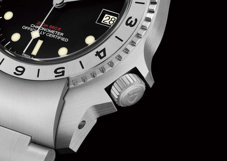 ▲不对称的表冠护桥是这款的一大特徵,包括表冠止滑纹路的样式和侧面的箭头刻字都跟原版如出一辙。外装採用了GS等级的超镜面研磨,但由于这款的表面处理主要以髮丝纹构成,实际能展现镜面的面积并不大。