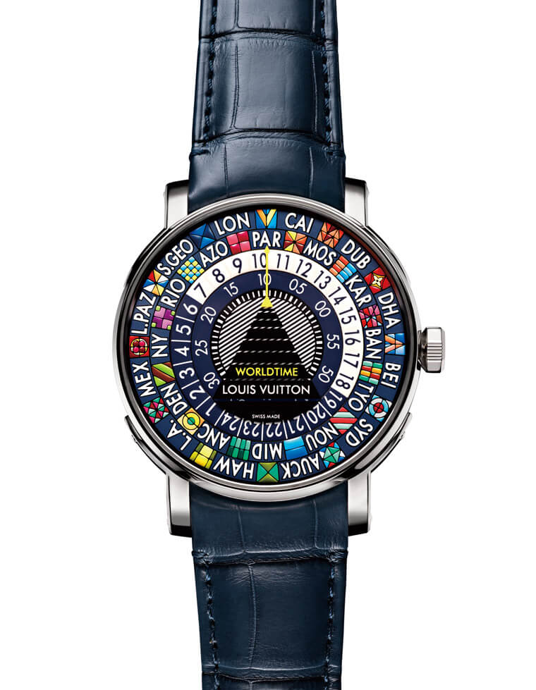 LOUIS VUITTON路易威登最早于2014年发表Escale Worldtime,表款面盘上具备色彩绚烂的几何图案微型画,加上以指标搭配时、分圆盘的少见设计,开创出世界时间腕表的新局,这样的设计让人联想到品牌的订制皮箱作品,尤其鲜艳亮丽的顏色刚好也与中文的「花花世界」意境契合,极具原创性的风格在一推出时就迅速获得市场的关注。