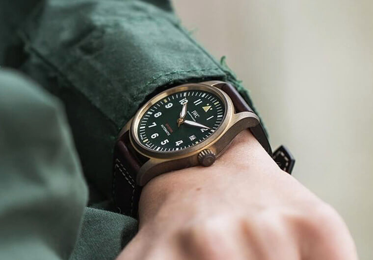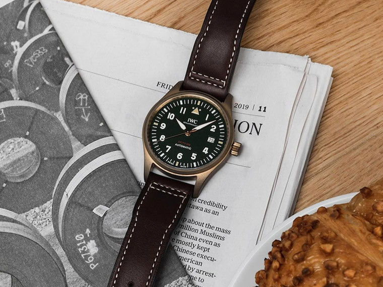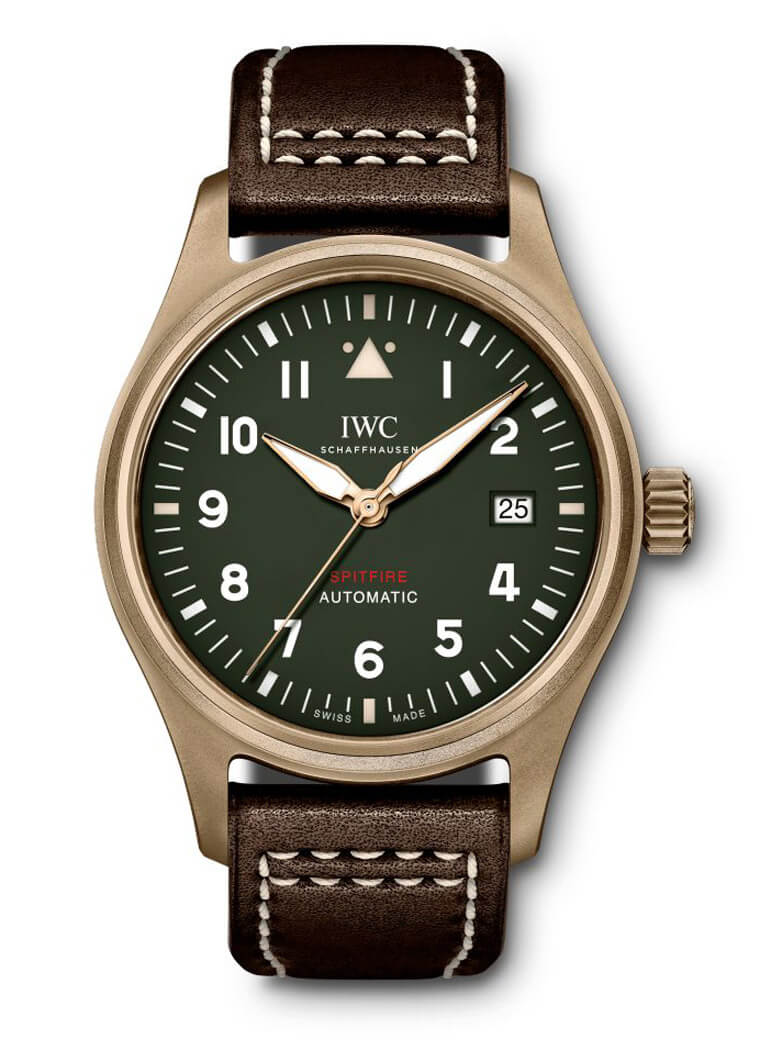 新款IWC喷火战机系列青铜表有几个共同的特徵,除了刚出厂的表壳都带有一致的青铜温润色调,它们还一律採用橄欖绿色面盘并搭配棕色的小牛皮表带,这样的配置并非偶然,绿面未来能与铜锈的色泽内外呼应,棕色表带的暖色系在长期佩戴后也能像表壳般留下一些岁月的痕跡,以上都能确保喷火战机系列青铜表「愈戴愈有味道」。