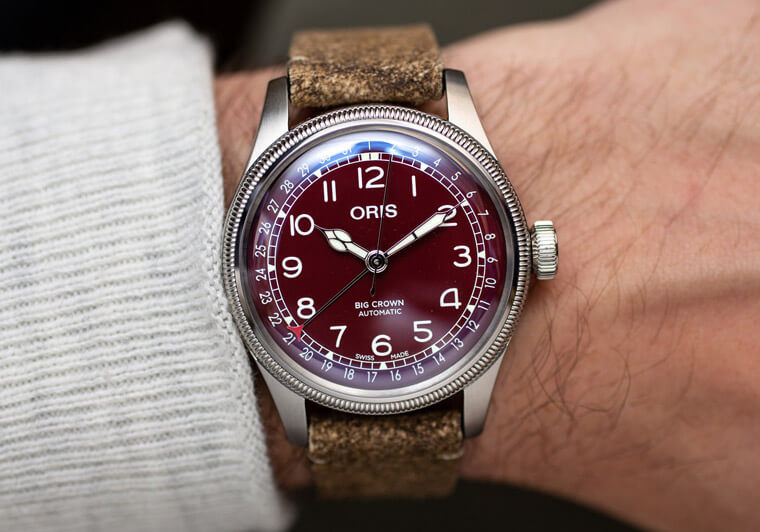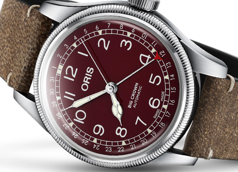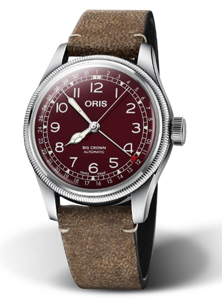 ORIS的Big Crown系列诞生于1938年,表如其名这是一款表冠相对设计的较大型的作品,用意是为了让飞行员就算戴着手套也可以方便操作手表,另外当时的日期显示不像现在以视窗设计为主流,还是以指针式日期为主,同时面盘上的时标也设计得比较大一些,让飞行员不用刻意把表凑近眼前也能看清楚时间。距离这款表的原版作品问世不知不觉已经超过80年,2019年品牌除了发表青铜绿面的纪念款,也同步推出不锈钢酒红面的款式。