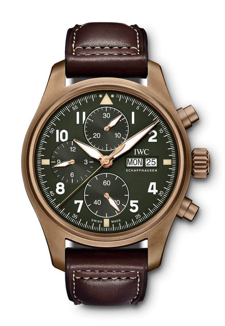 IW387902/青铜材质/69380自动上链机芯/时、分、小秒、日期、星期显示/计时码表功能/蓝宝石水晶镜面/防水60米/表径41mm/参考价:NT$ 211,000
