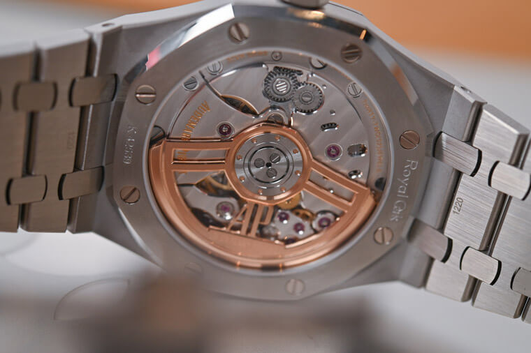 爱彼在2019年最大的头条还是新推出CODE 1159这个全新系列,随着系列诞生,品牌也大手笔地研发出三枚自制机芯,包括自动机新、计时机芯以及陀飞轮机芯。新款的皇家橡树三针表正是移植了原本看似为了CODE 1159而生的自动机芯4302,与RO三针表原本搭载的3120机芯相比,除了K金自动盘的样式有点改造(4302机芯自动盘部分有镂空处理),新机芯的动力储存空间(70小时)以及震频(4Hz)都较3120机芯有所提升,当然3120机芯是久经市场历练的作品,4302纯粹数据来看是有所进步,但它同样需要一点时间来累积自己的口碑,因此藉由新款皇家橡树手表的推出,也能让更多品牌爱好者体验到新机芯的水准。