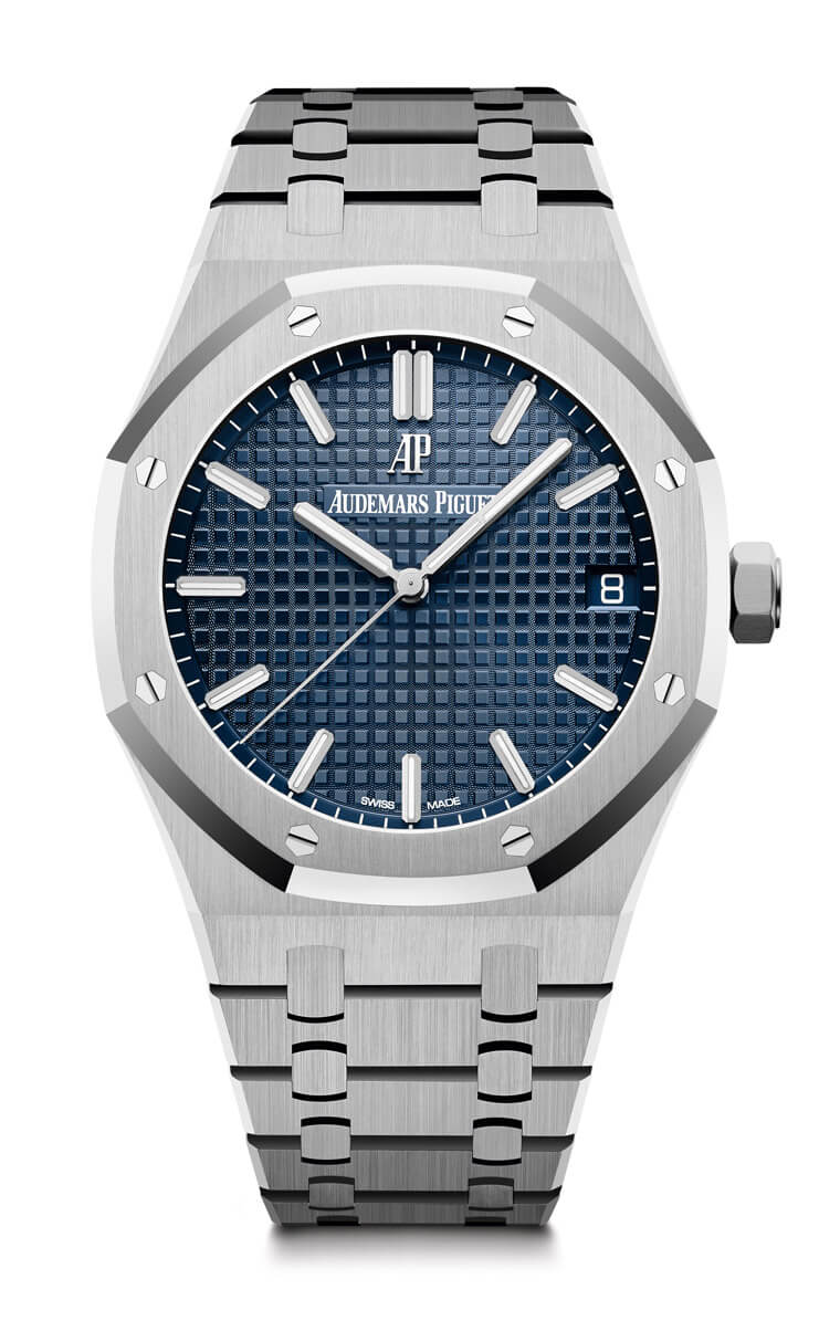 AUDEMARS PIGUET爱彼皇家橡树是高级运动表市场中的人气宠儿之一,尤其不锈钢款式搭配蓝色面盘这种经典设计更是许多人心中的天菜手表,目前男款的皇家橡树基本款大概可以分为41mm和39mm两种款式,后者是延续初代RO而来的设计,包括它的超薄表壳、相对秀气的39mm表径以及比较基本的二针显示等,另一种表径较大的款式则更有现今皇家橡树系列基本款主力的味道,虽然它不像39mm款式那般如此强调超薄设计,但是它具有三针+日期功能,就视读习惯来说比较符合现代需求,同时它的款式也更多,除了不锈钢款、半金款和玫瑰金款以外,面盘顏色的选择也有诸如、蓝面、白面、黑面或灰面等。41mm三针款的皇家橡树手表在2019年又加入了三款钢壳新成员,它们最主要的变化在于搭载的机芯不同(但仍然是自动上链),因此目前同样是41mm的皇家橡树基本款,市场又多出了一个版本可以选。